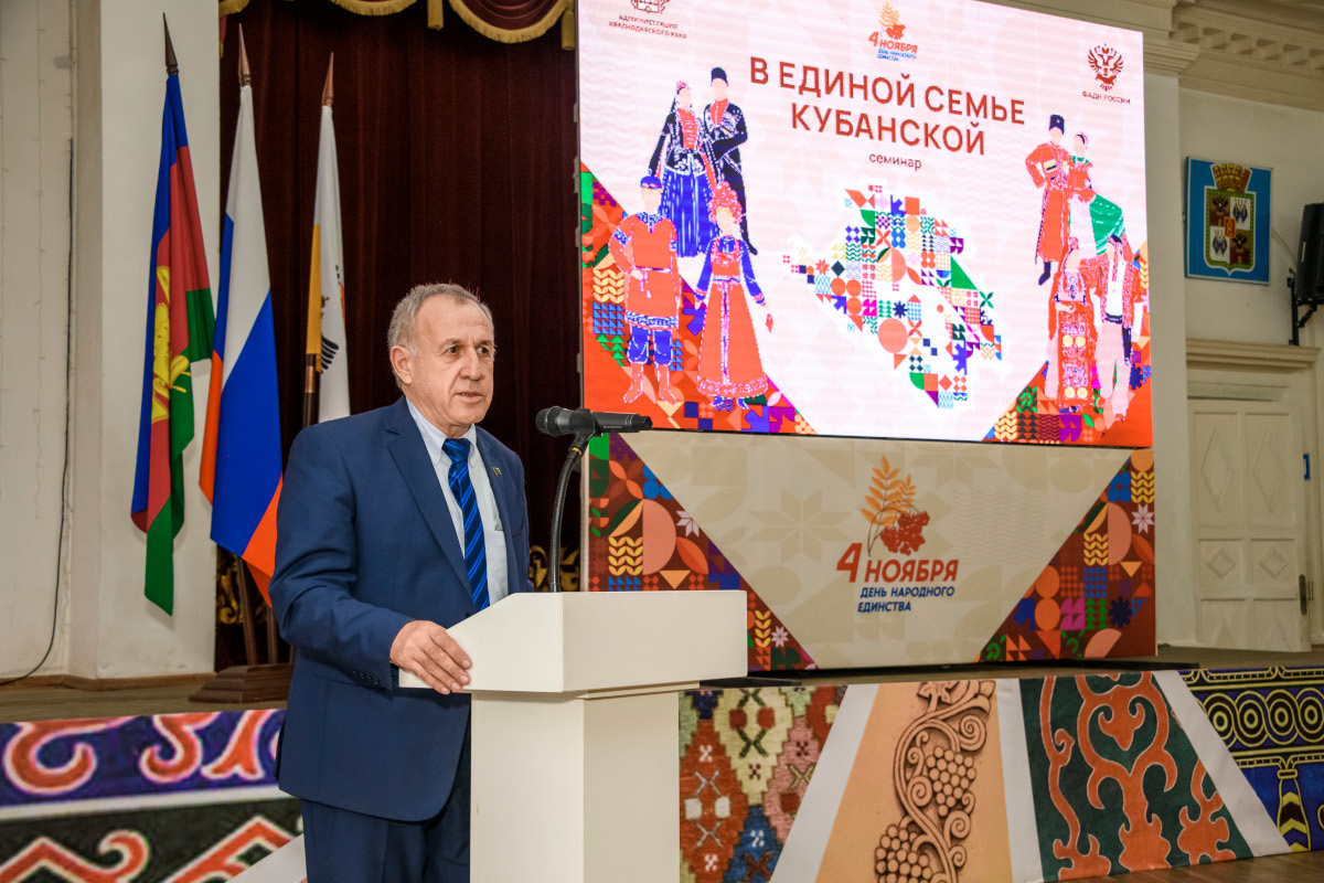 Информационно-познавательный семинар по укреплению единства российской нации «В единой семье кубанской» прошел 14 ноября в Центре национальных культур. Мероприятие организовано департаментом внутренней политики администрации Краснодарского края в здании Общественно-информационного центра г. Краснодара и было посвящено Дню народного единства.