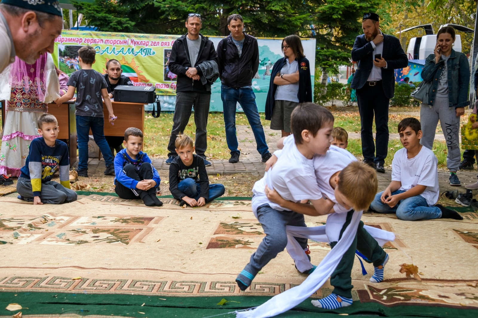 В это же время на открытых площадках перед сценой проходили национальные татарские игры для детей «Бег с коромыслом», «Бег в мешках», «Бег с яйцом на ложке», игра «Парочка в завязочке», «Перетягивание каната», «Бой горшка», «Бег на ходулях» и конкурс для самых маленьких «Детские жмурки».