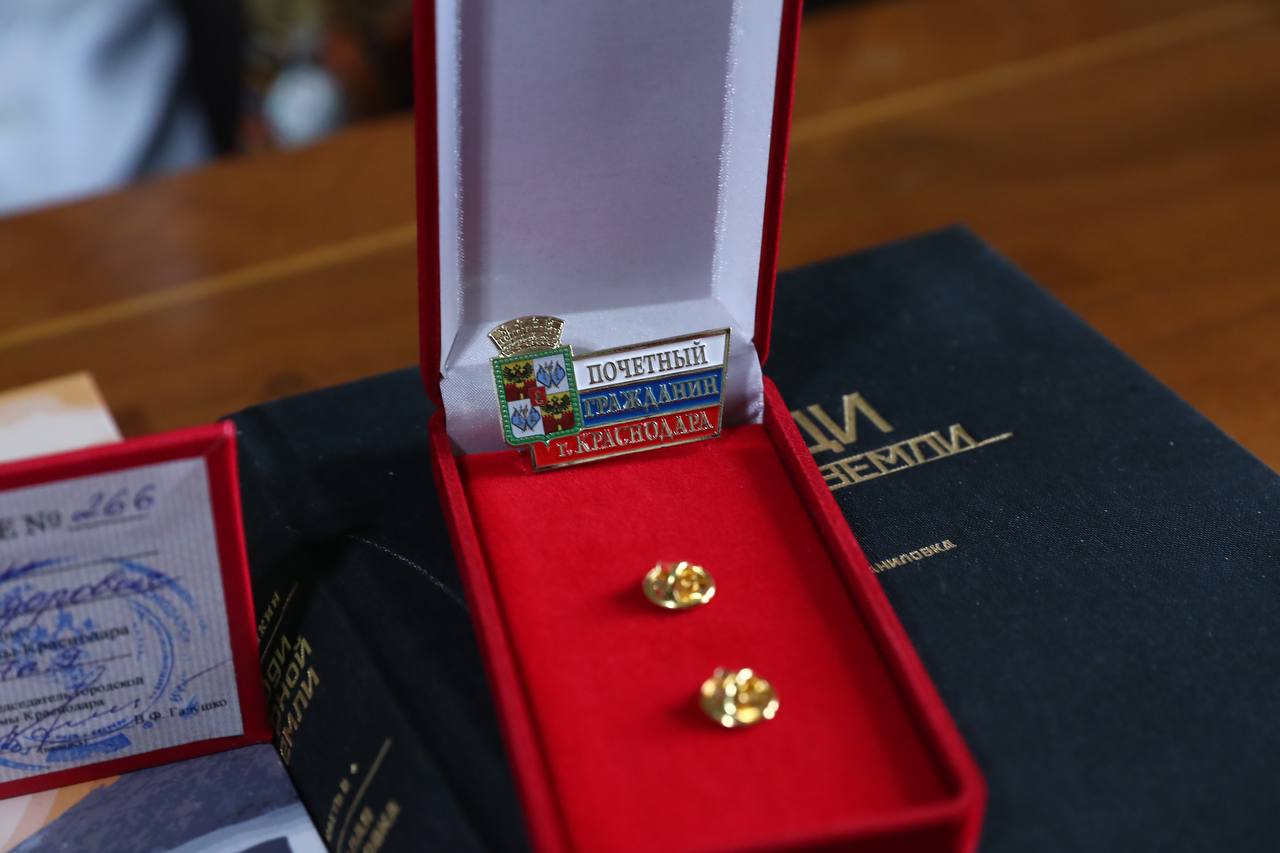Депутат городской Думы Краснодара Аслан Нехай и заместитель главы администрации Западного округа Светлана Смольская вручили знак Почетного гражданина города Краснодара участнику Великой Отечественной войны Николаю Федоровичу Синякину.