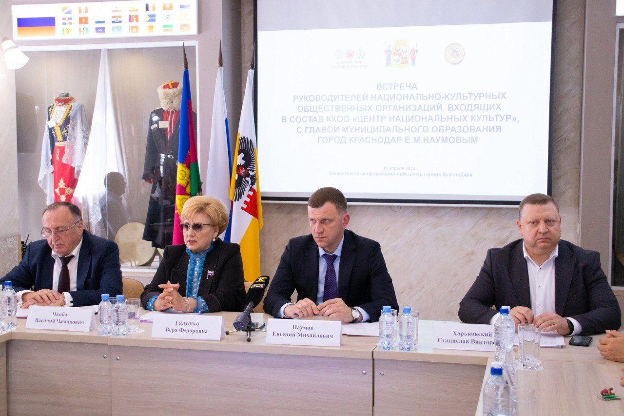 18 апреля состоялась рабочая встреча главы муниципального образования город Краснодар Евгения Наумова и председателя городской Думы Краснодара Веры Галушко с лидерами национально-культурных объединений Центра национальных культур.