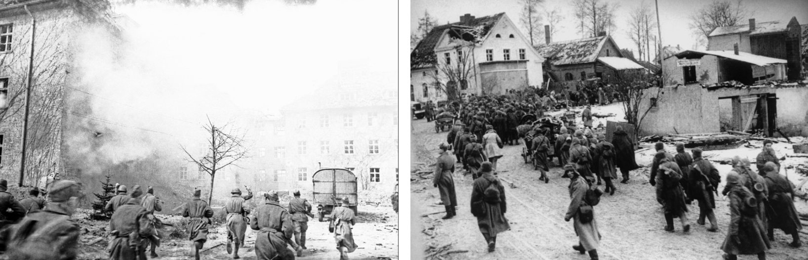 6–9 апреля войсками 3-го Белорусского фронта (Маршал Советского Союза А.М. Василевский) при содействии Балтийского флота и авиации была проведена Кенигсбергская наступательная операция. Перед войсками стояла сложная задача: одновременными ударами с севера и юга окружить и уничтожить кенигсбергскую группировку фашистов и взять город и крепость Кенигсберг. Перед началом штурма артиллерия в течение 4 дней разрушала оборонительные сооружения противника. К исходу 6 апреля советские войска ворвались в Кенигсберг, 8 апреля отрезали гарнизон крепости от войск, действовавших на Земландском полуострове, а 9 апреля после массированного удара артиллерии и авиации и ожесточенных атак советских войск гарнизон капитулировал. В ходе операции было уничтожено около 42 тыс. солдат и офицеров, взято в плен около 92 тыс. человек.
