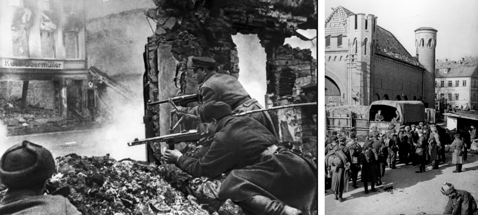 Уличные бои в Кенигсберге; немецкие солдаты сдаются в плен, 1945 г.