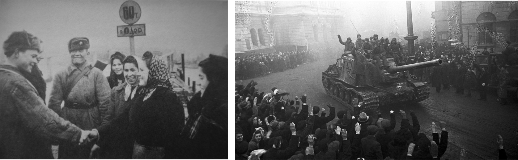 Встреча с местными жителями на р. Одер, 1945 г.; советские войска в освобожденном г. Лодзь, январь 1945 г.